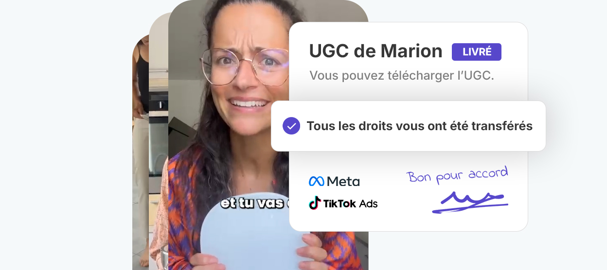 Diffusez vos contenus UGC en organique ou en publicité pendant 2 ans. Tous les droits d'usage sont inclus dès le départ.